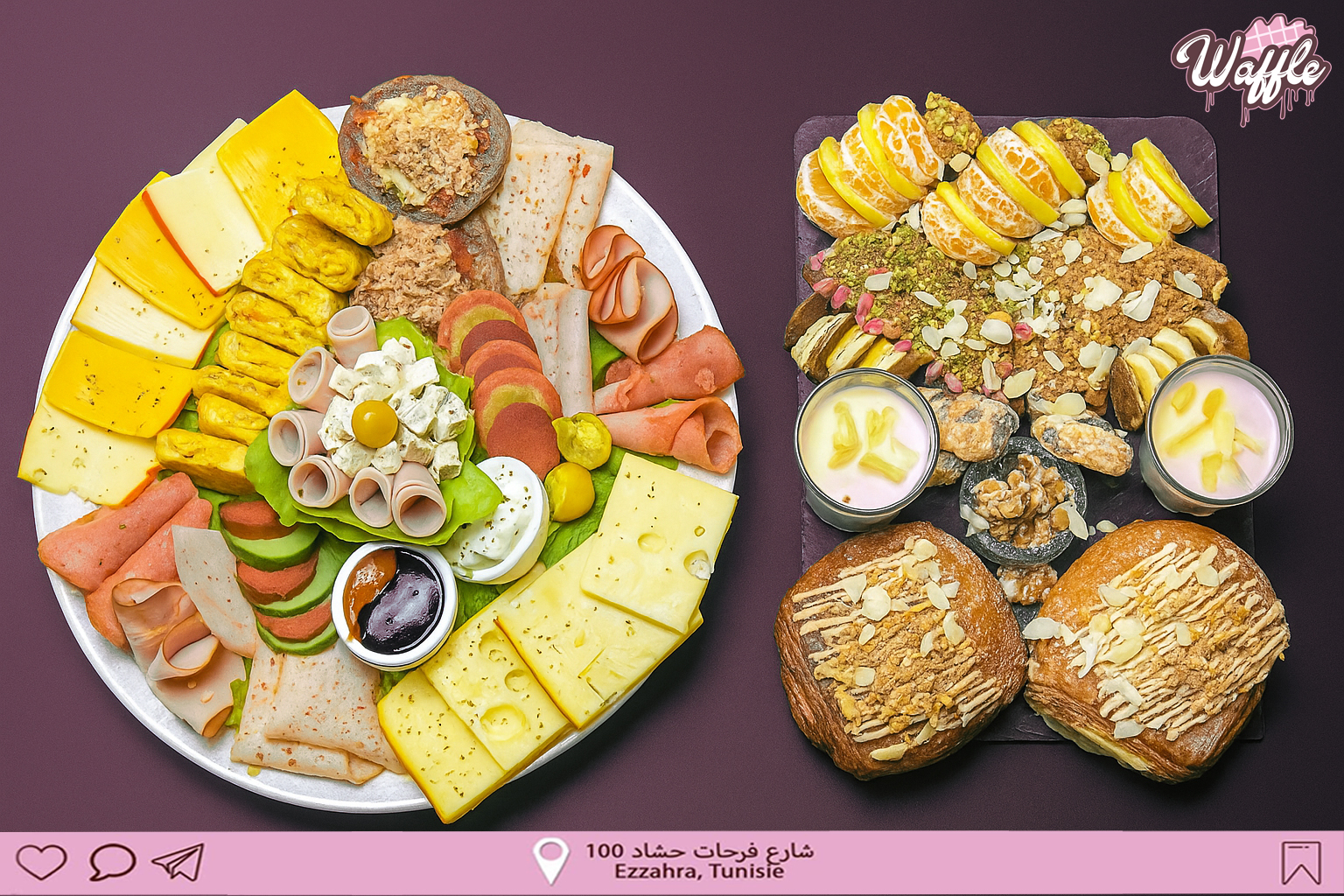 2 Cafés au choix, 2 Jus frais, 2 Yaourts aux fruits, 2 Croissants +cake, 2 Mini pizza-pancake,2 Mini pancake sucré, Omelettes, ,Charcutterie, 1L Eau, Fruits De saisons