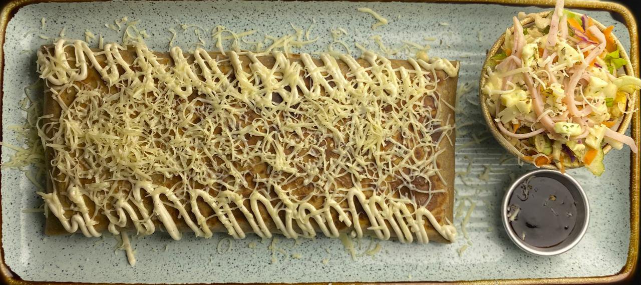 Escalope sauté à la crème, légumes sautés, champignon, mozzarella, gruyère+salade